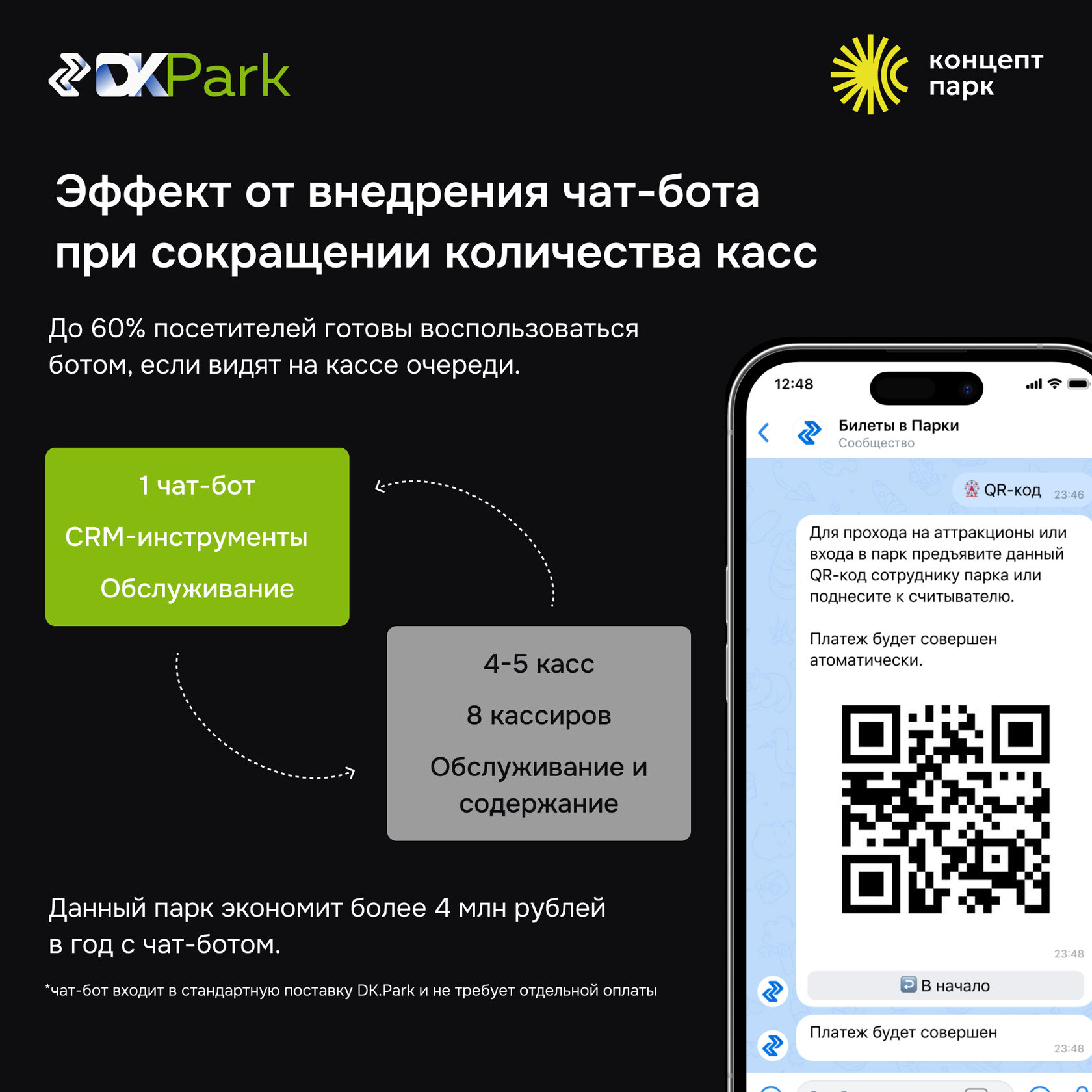 Только представьте. Посетителям, которым не нужно покупать льготный билет, больше не требуется классическое парковое оборудование — могут через чат-бот в 2 клика обеспечить вход. Так любой парк легко сократит расходы на кассиров и терминалы самообслуживания — показываем в цифрах в инфографике далее.